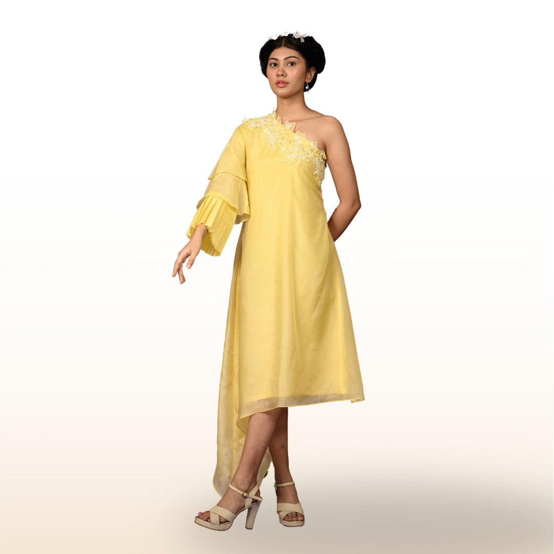 One shoulder, all the style. This yellow glass organza dress is all about making a statement, whether you're walking into a wedding or a rooftop soirée. Bright, bold, and unapologetically chic!