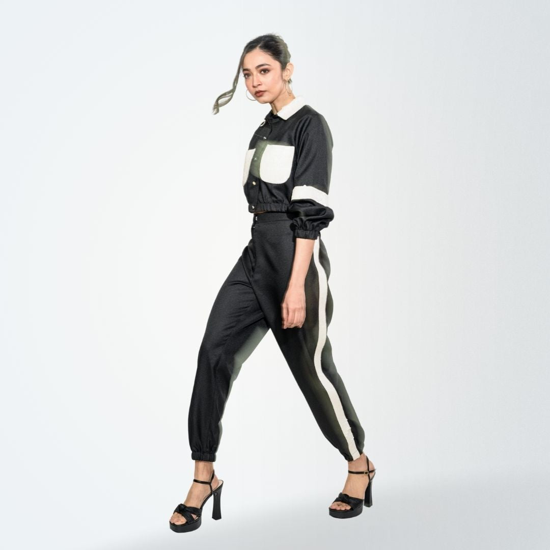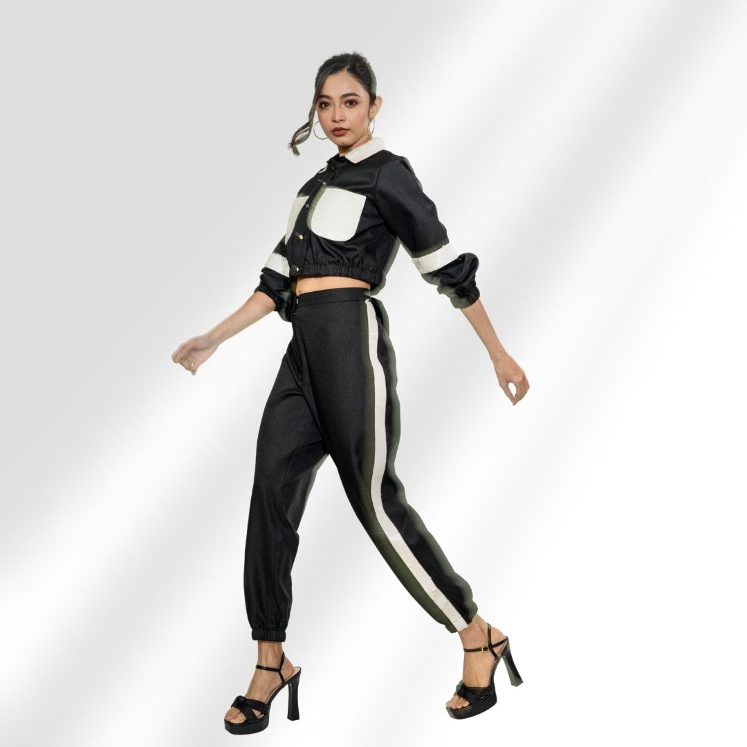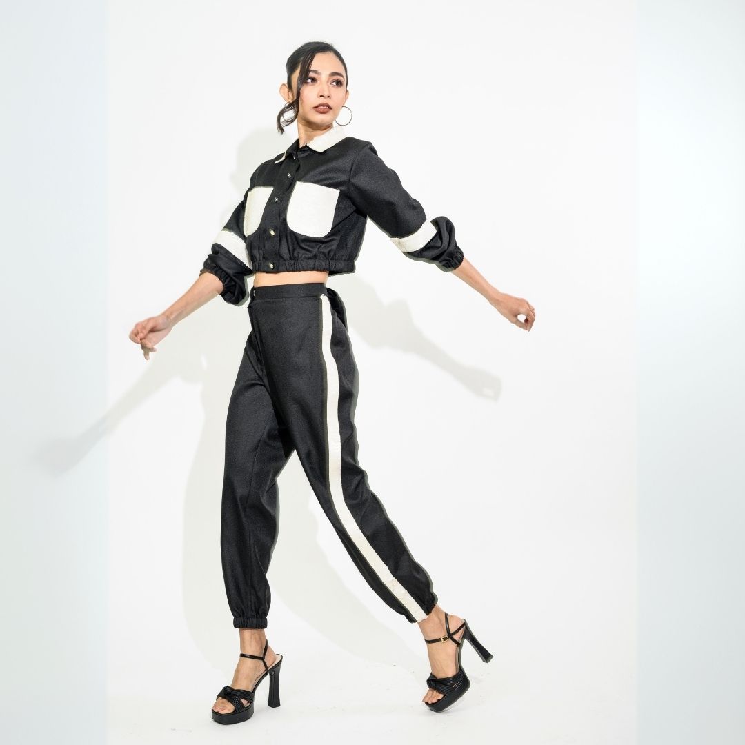 Joggers but make them chic! This co-ord set features monochrome sequin embroidery on the pockets, collar, and side seams for a sleek, fashion-forward look. It’s comfy enough for all-day wear but polished enough to slay any social scene.