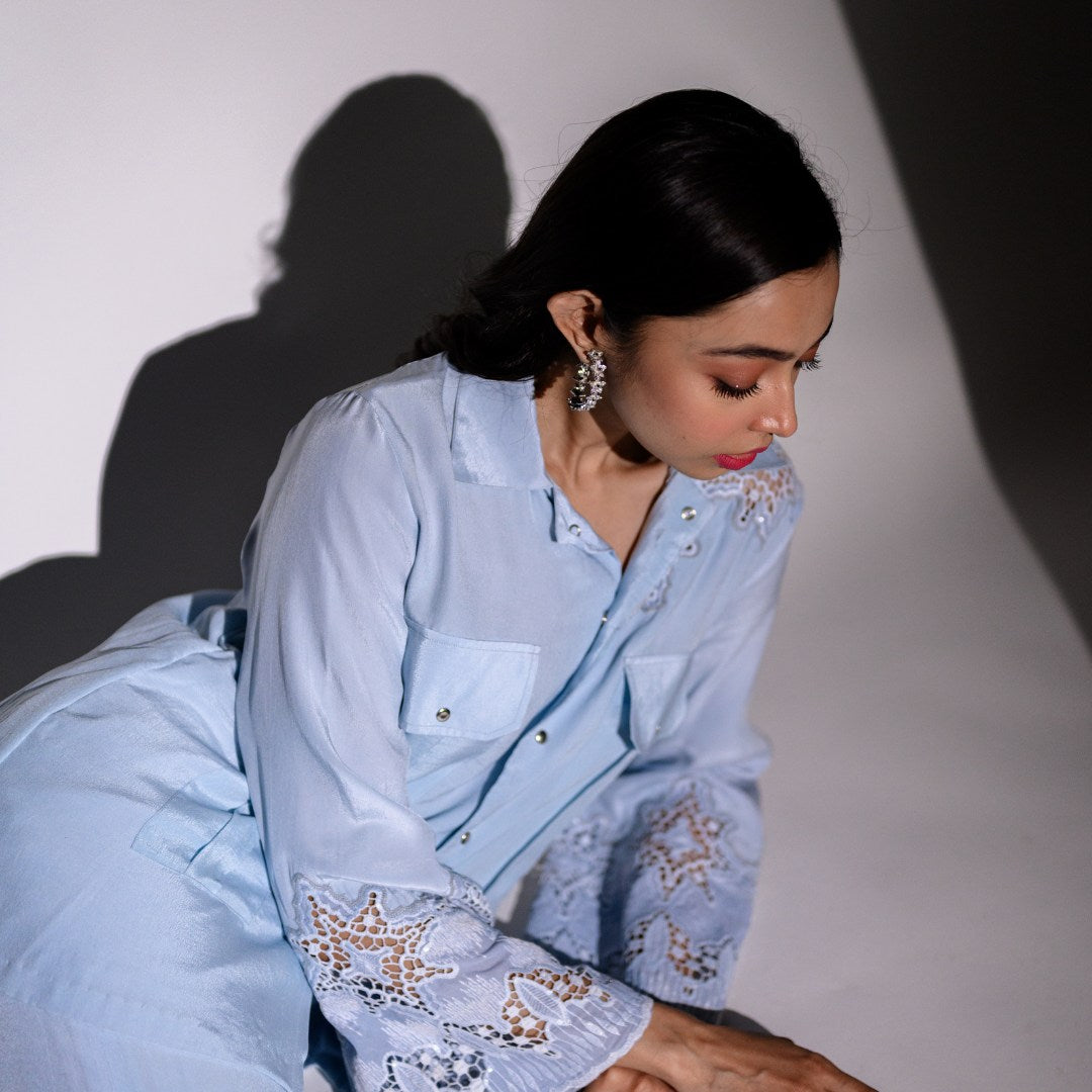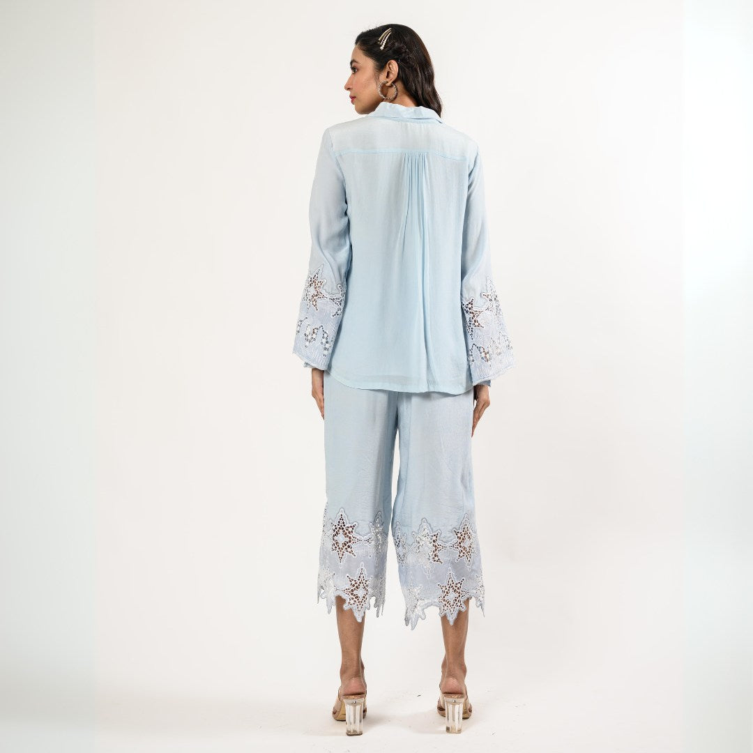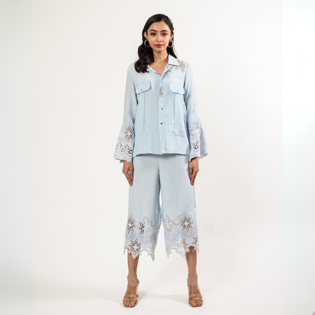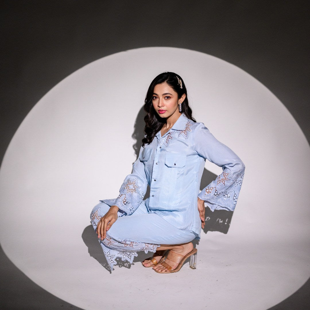 A co-ord set with flower appliqué on both the shirt and pants' hems, giving you a fresh and modern vibe. This look is effortlessly cool, for the days when you want to stand out without trying too hard.
