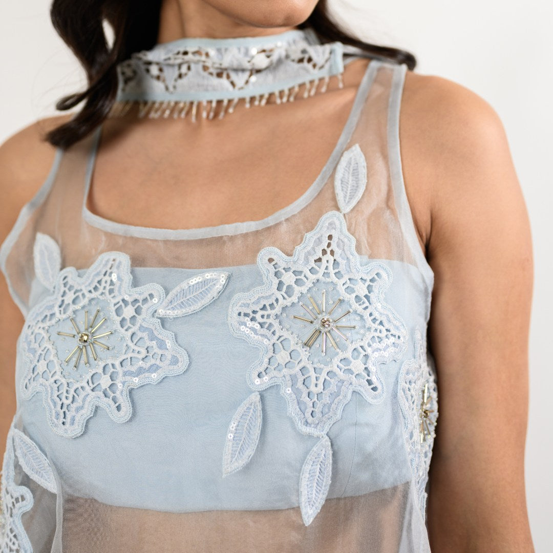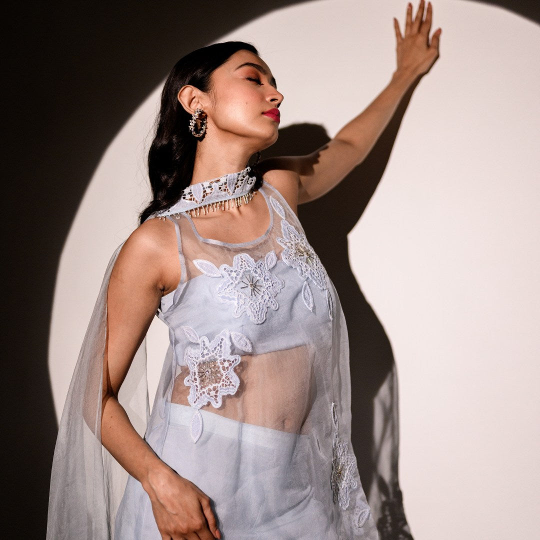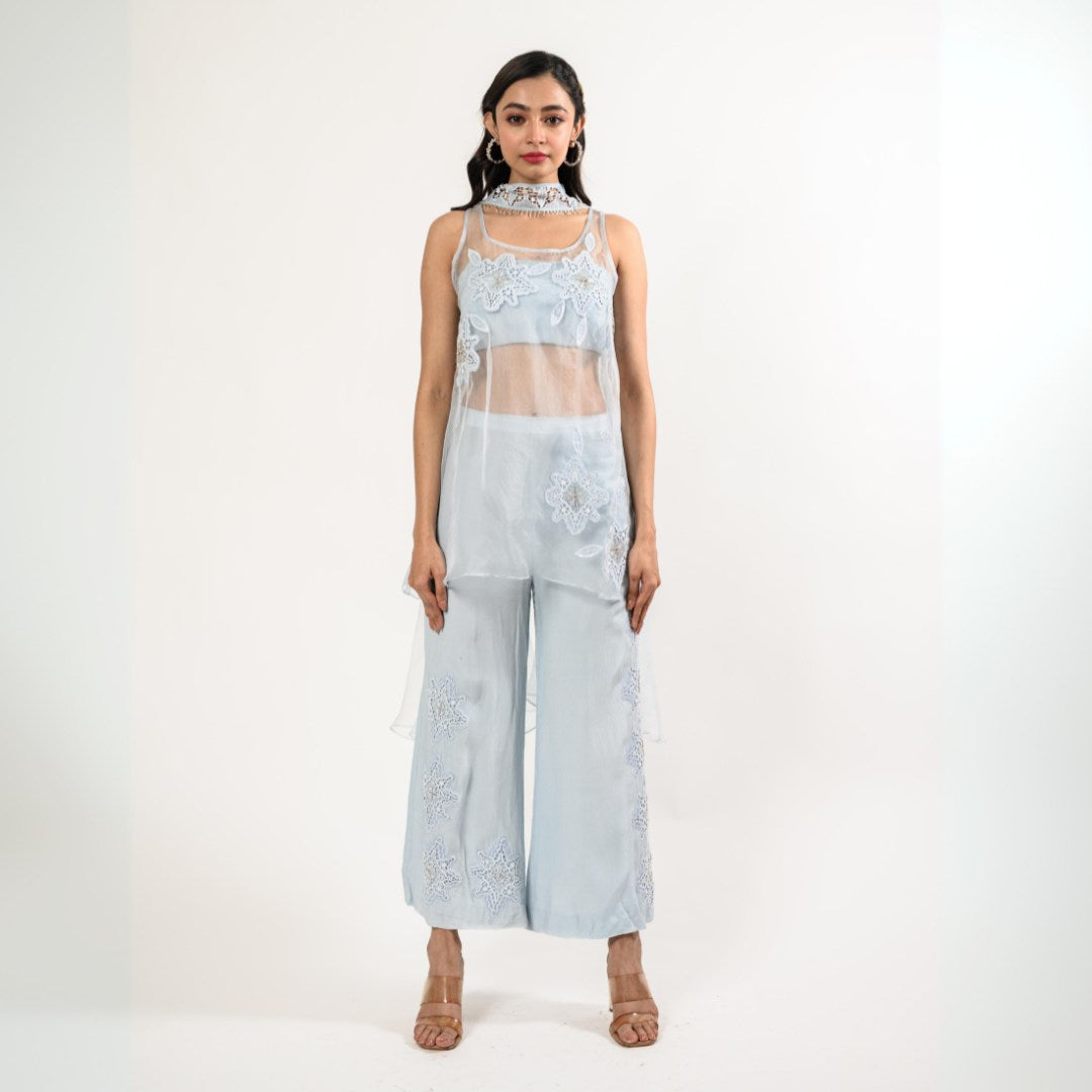 A long tunic paired with pants and a handcrafted organza stole. The delicate appliqué details add just the right touch of elegance, making this look perfect for when you want to keep it simple yet stunning.