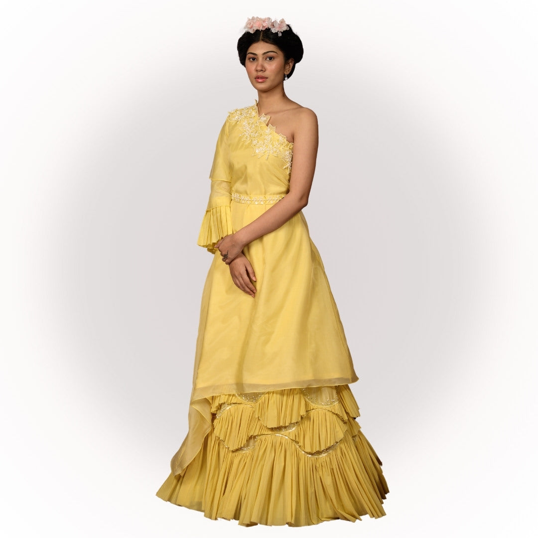Bring the sunshine with you in this bold yellow short top with an A-line skirt. The perfect combo for those bright days when you want your outfit to radiate as much energy as you do.