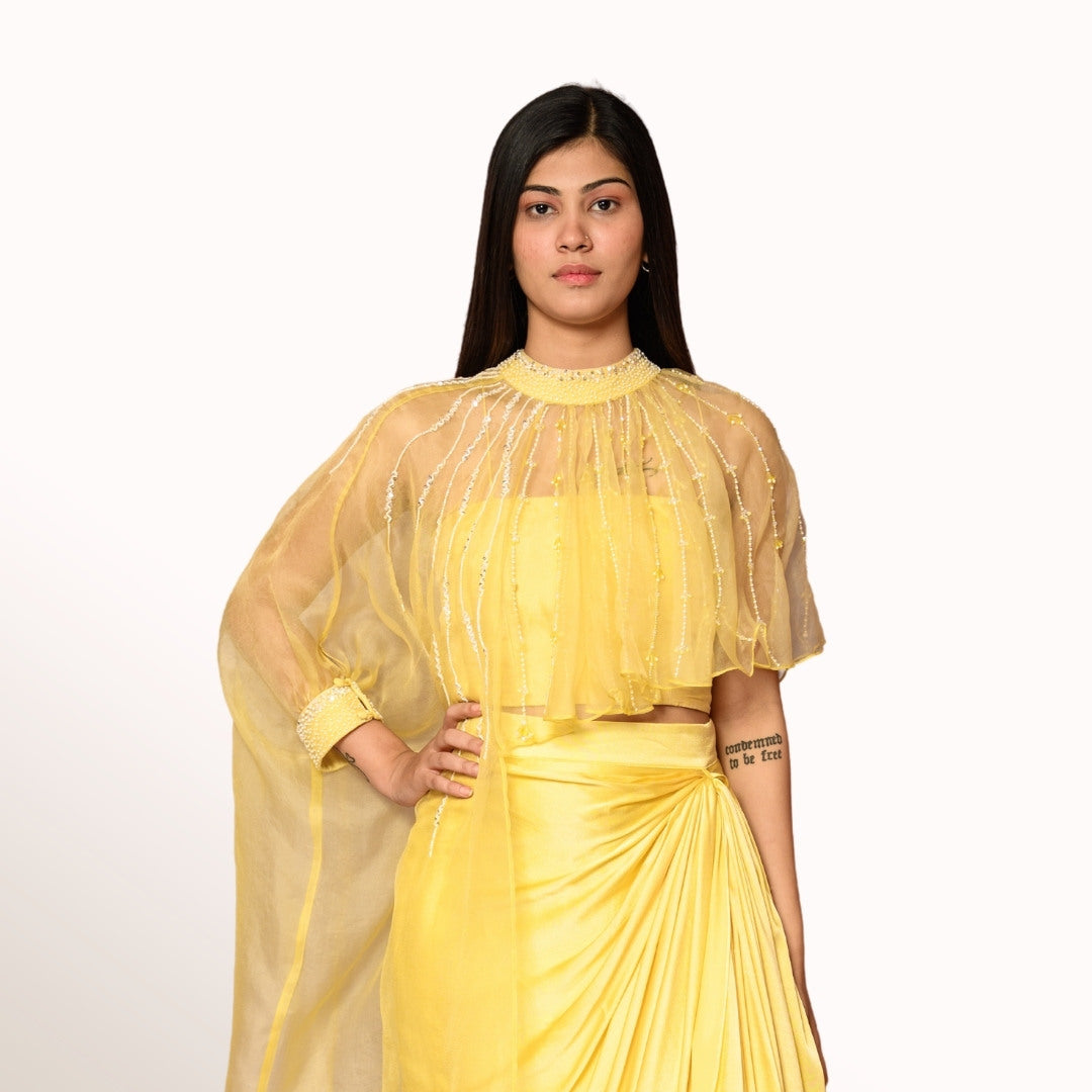 Flow through the night with this champagne white cape, bustier, and drape skirt. The feather-light fabric makes it dreamy and effortless for those extra special occasions when you want to feel like you’re walking on air!